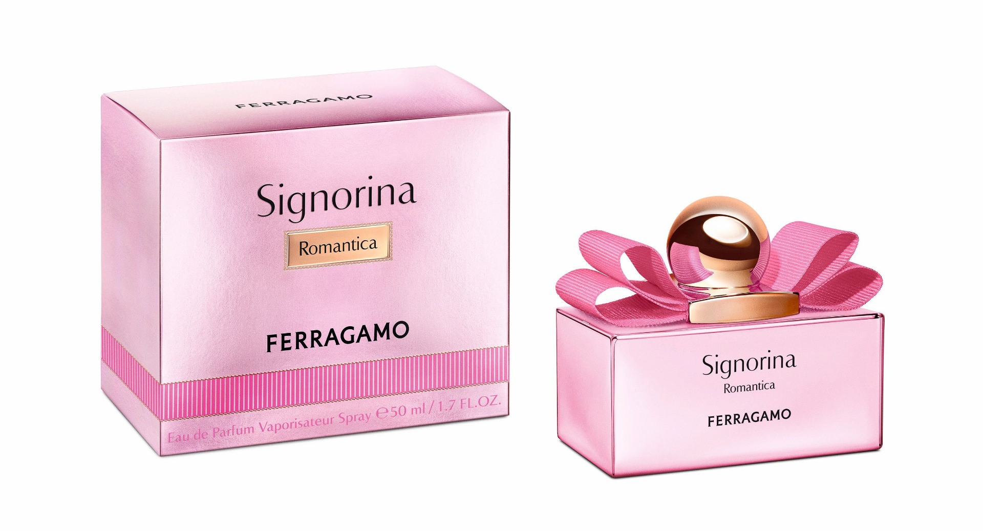 V souladu s elegancí celé kolekce se Signorina Romantica představuje v ikonickém flakonu zdobeném charakteristickou mašlí Vara ze žebrované stuhy. Nové metalické růžové lakování flakonu vyzařuje mladistvou energii a příslib nekonečných možností.