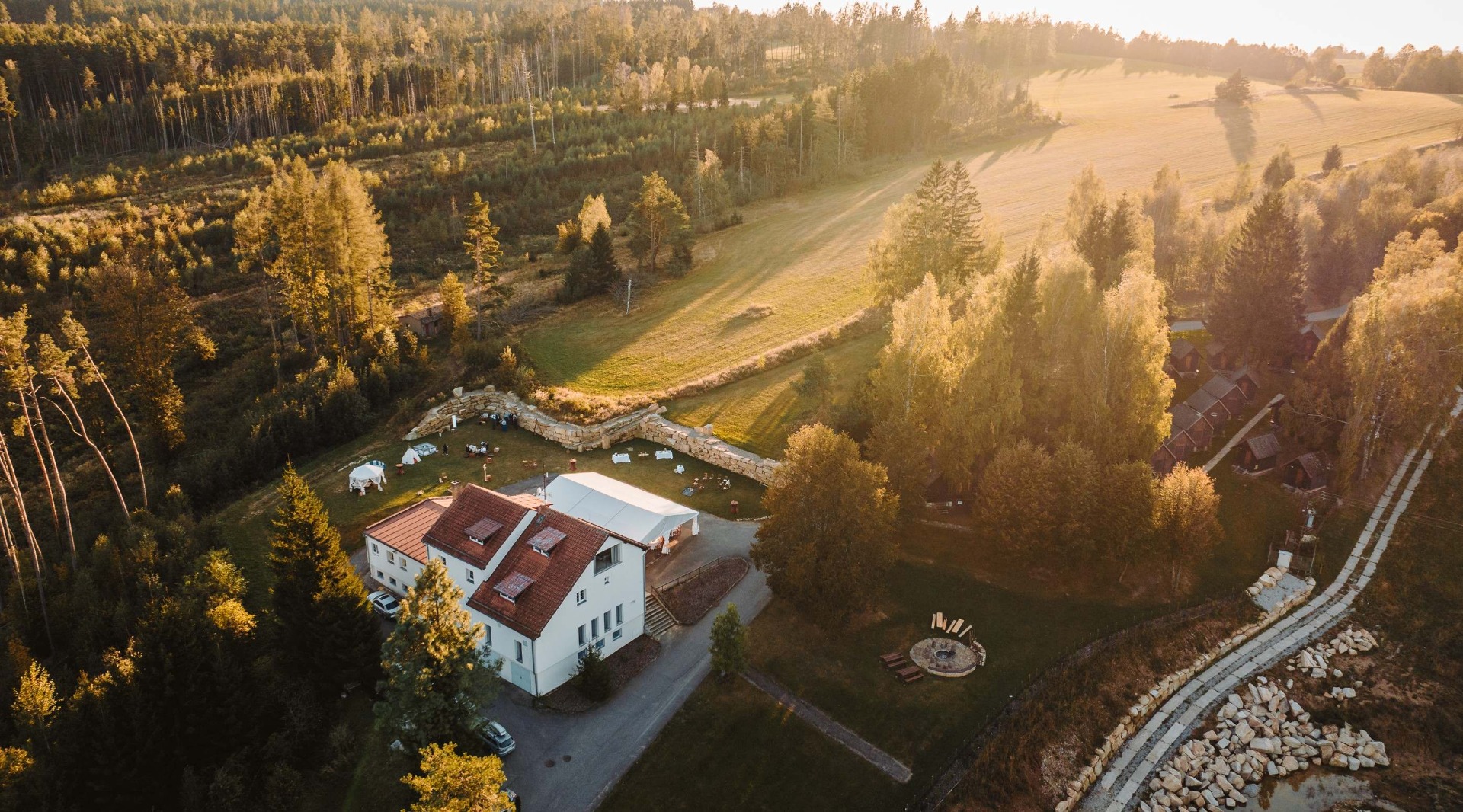 Ráno začíná v klidu. Káva na kamenné zdi, ranní ticho a lehká mlha nad loukami. Přes den obřad pod širým nebem, obklopení zelení a lidmi, které máte nejraději. Večer se areál rozzáří světly, na každého z hostů čeká jeho vlastní chatička, a tak může svatba trvat tak dlouho, jak budete chtít.