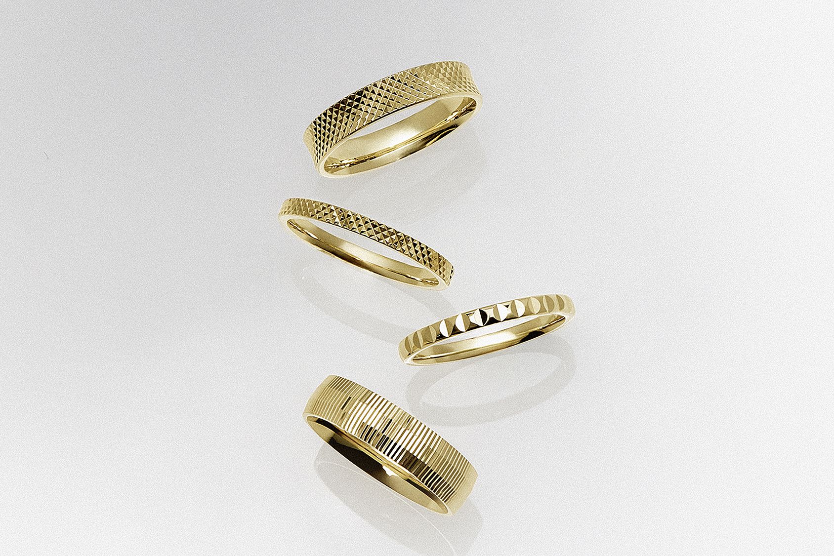 V této kolekci jsme se rozhodli nechat vyniknout samotný materiál. Místo kamenů přichází ke slovu zlato – jeho struktura, lesk a schopnost odrážet světlo. Broušené plochy diamantovými noži a jemné rytiny vytvářejí efekt, který se proměňuje s každým pohybem ruky. Prsten tak nepůsobí staticky, ale živě – reaguje na světlo i na způsob nošení. Inspiraci jsme našli ve zlatnické technologii, která byla populární v 90. letech, ale prstenům jsme dali současnou podobu – čistší a výraznější.